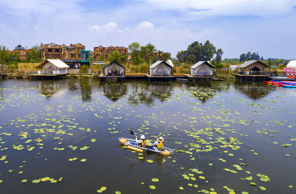 游人在滇池南岸晋宁区上蒜镇小渔村划船休闲(2023年4月30日摄,无人机照片)。新华社记者 陈欣波 摄